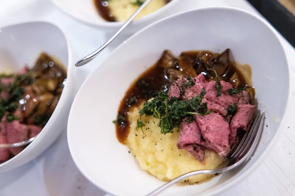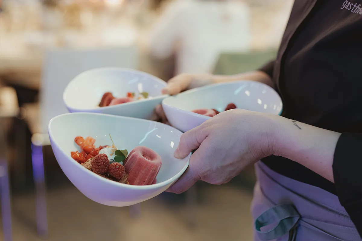 Risotto mit frischen Pfifferlingen und Kräutern (veggie) *** „Label Rouge“-Lachs am Brett geflämmt mit Creme Fraiche, Paprika, Cornflakes und Kresse *** Knuspriger Porchetta – gekräuterter Schweinbauch mit Rosmarinkartoffeln und Bratenjus *** Himbeer-Pistazien-Tiramisu