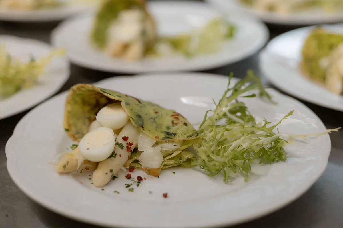 Bärlauchpfannkuchen mit Frühlingssalaten und mariniertem Spargel *** Frühlingskräutersuppe mit Radieschen und Croutons *** Gemüsestrudel mit Paprikasauce, Butterzucchini und Austernpilzen *** Schokoladenküchlein, Himbeersorbet und frische Früchte