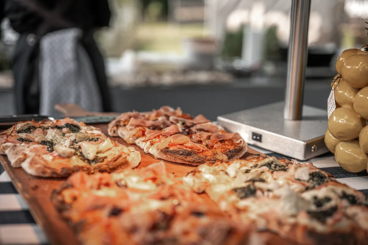 Weiß mit Scamorza, Pesto, Artischocken und Rosmarinschinken *** Rot mit Tomatensauce, Oregano und Kirschtomaten *** Dazu verschiedene Toppings: Basilikum, Bresaola, Babymozzarella und Taggiasca Oliven